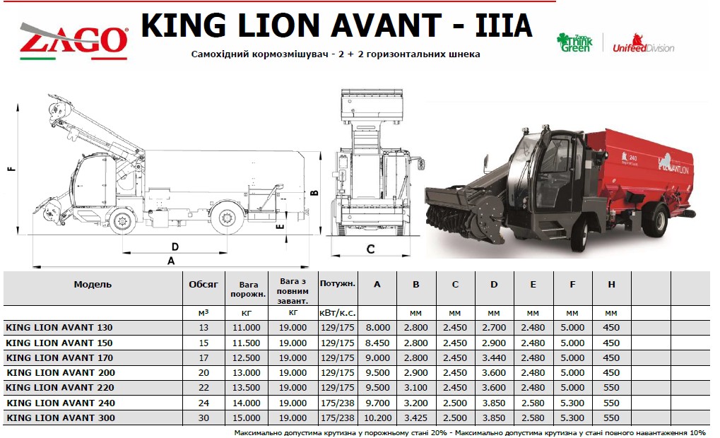ZAGO King Lion Avant — професійний самозавантажувальний кормороздавач-фрезер, створений для ефективної роботи на молочних, м’ясних та змішаних тваринницьких фермах.Це універсальна машина, яка завантажує, подрібнює та роздає корм в одному циклі, суттєво зменшуючи витрати часу та пального.